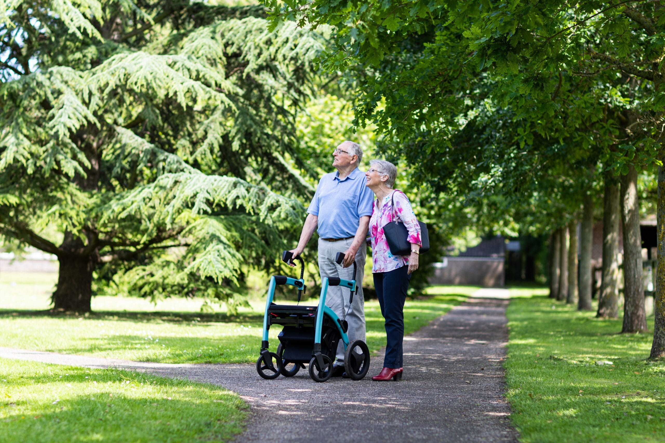 Rollatorn är enkel att fälla ihop för transport. Bakhjulen kan vikas in så att den får plats i bilens bagageutrymme. En kraftfull LED-lampa ökar din synlighet och säkerhet både i mörker och i trafiken. Två rymliga förvaringsväskor finns som tillbehör.