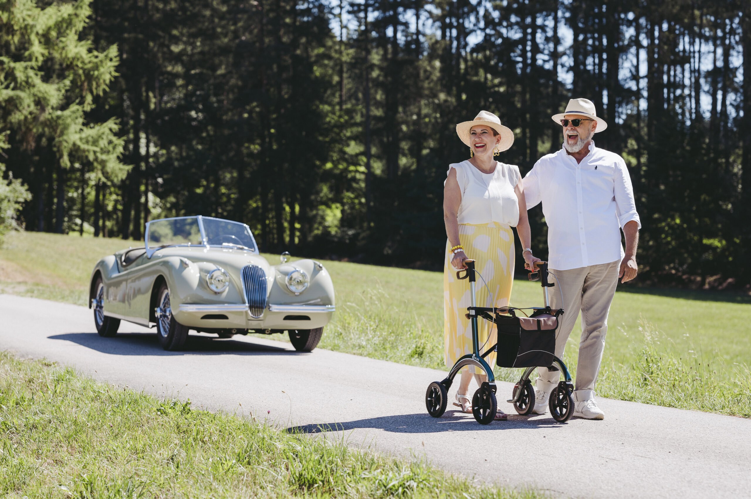 Den lätta rollatorn är också lätt att transportera för personer med mindre styrka. Du kan enkelt lasta in din rollator i bilen. När rollatorn är hopfälld kan du till och med bära den uppför trappan med en hand. Då har du den andra handen fri att hålla i ledstången.